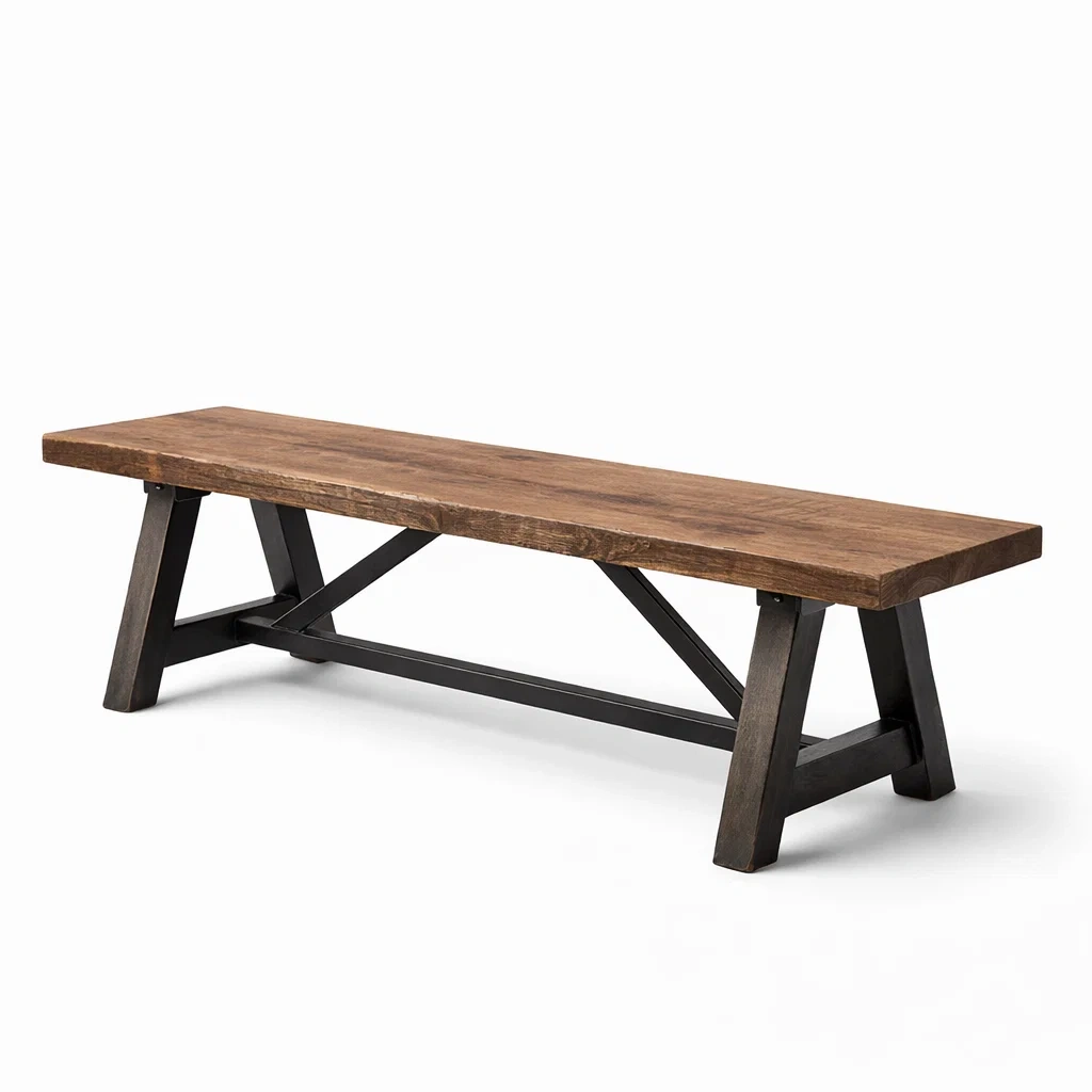 Le banc est fabriqué avec un plateau en chêne massif et des pieds en acier. Il mesure 160 cm de longueur, 40 cm de largeur et 45 cm de hauteur. La couleur principale est Brun avec des éléments Noirs. Ce banc a un design industriel. Capacité de charge : 250 kg.